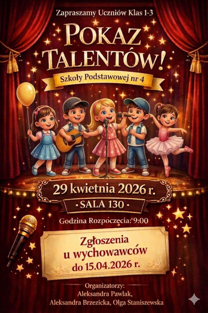 Serdecznie zapraszamy wszystkich uczniów do udziału w Szkolnym Pokazie Talentów, który odbędzie się: