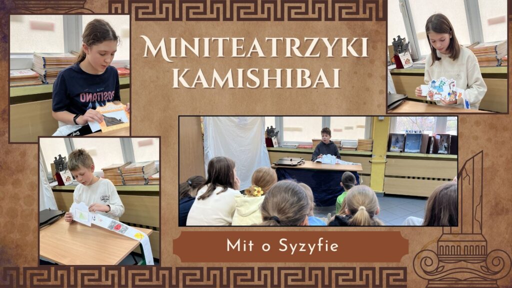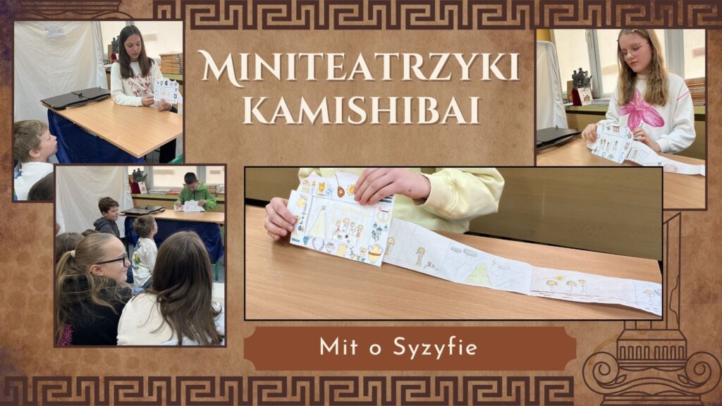 Kolejnym przystankiem była historia Syzyfa. Zamiast zwykłego streszczenia, uczniowie wykorzystali japońską technikę teatrzyku Kamishibai. Samodzielnie przygotowane ilustracje i narracja sprawiły, że opowieść o mozolnej pracy pod górę nabrała wyjątkowego charakteru.