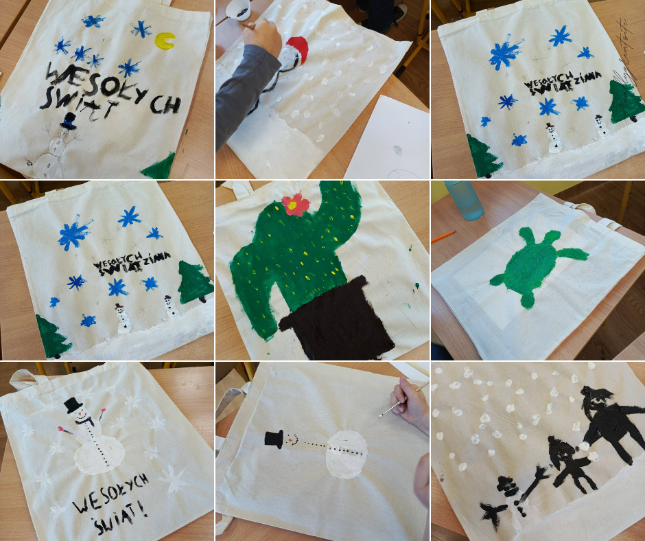 Na zajęciach pomysłodzielni, dzieci z wielkim zaangażowaniem malowały bawełniane torby, tworząc niepowtarzalne wzory i kolorowe dzieła sztuki. Było kreatywnie, radośnie i bardzo twórczo