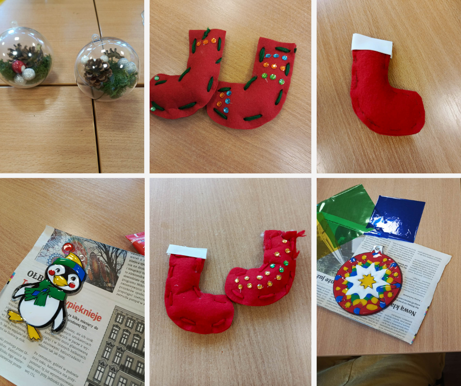 Grudzień na zajęciach pomysłodzielni upłynął w prawdziwie świątecznej atmosferze. Podczas zajęć dzieci z wielkim zaangażowaniem szyły ozdoby na choinkę, tworzyły kolorowe witraże oraz tworzyły plastikowe bombki.