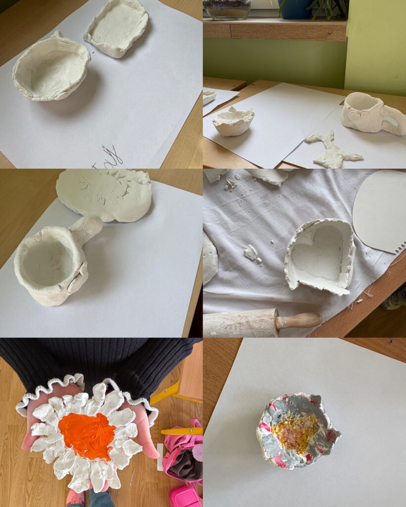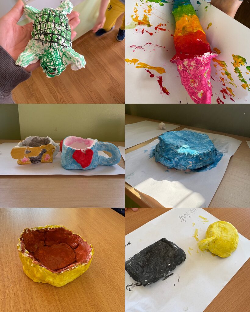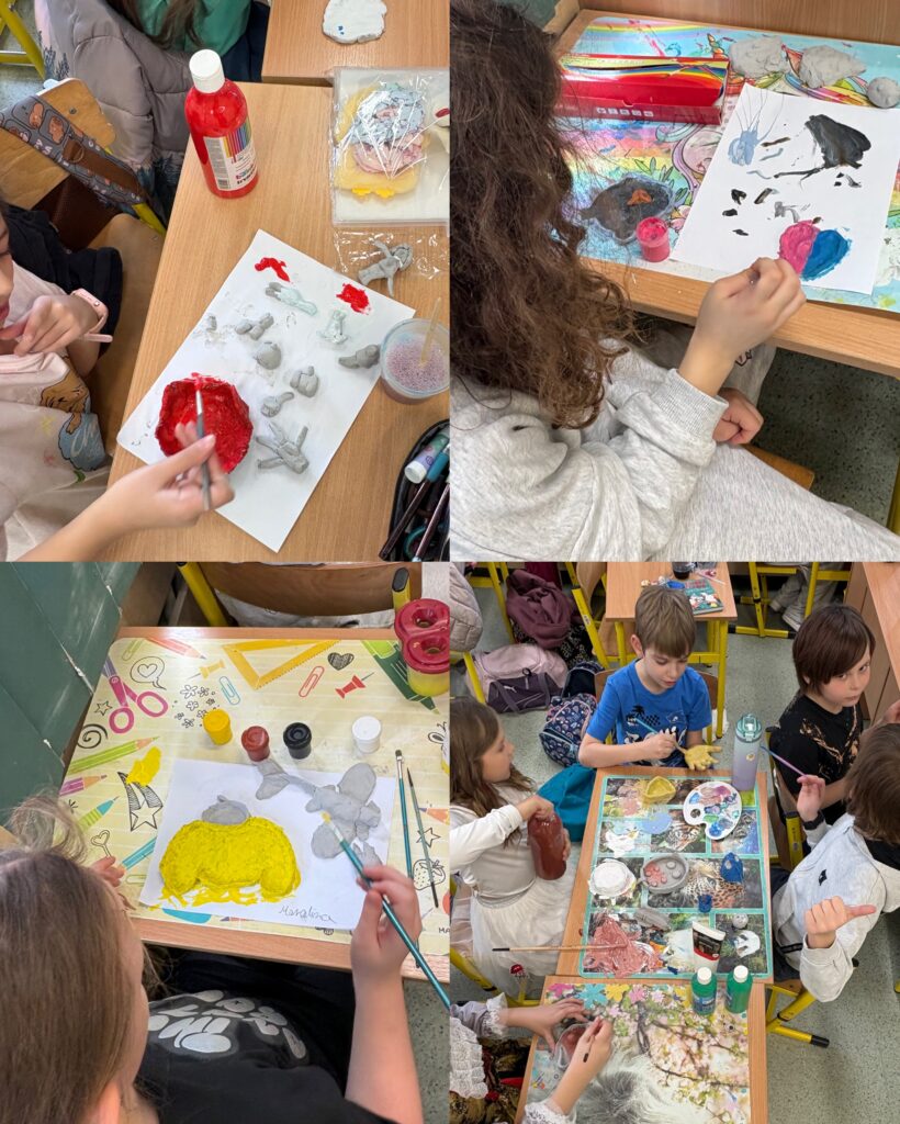 Podczas pierwszych zajęć uczniowie poznali podstawowe techniki pracy z gliną – ugniatanie, wałkowanie, formowanie oraz łączenie elementów. Powstały wyjątkowe figurki, miseczki, zwierzątka oraz fantazyjne stworki. Kolejne zajęcia poświęciliśmy malowaniu gotowych prac.