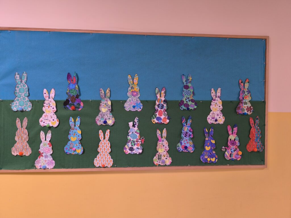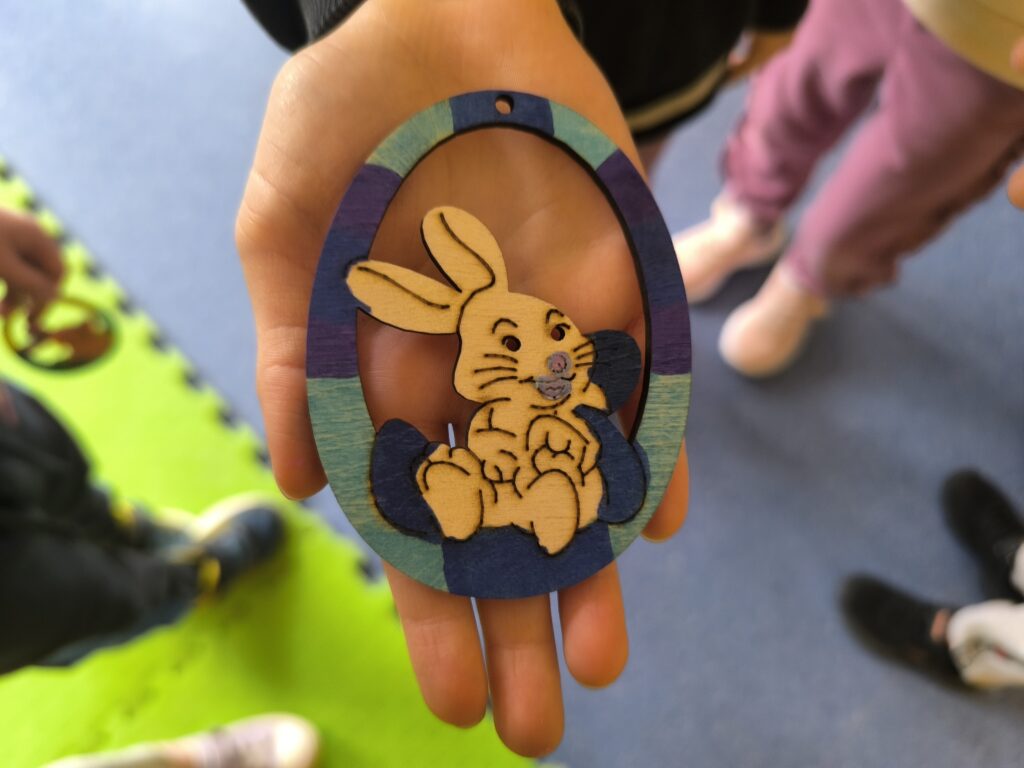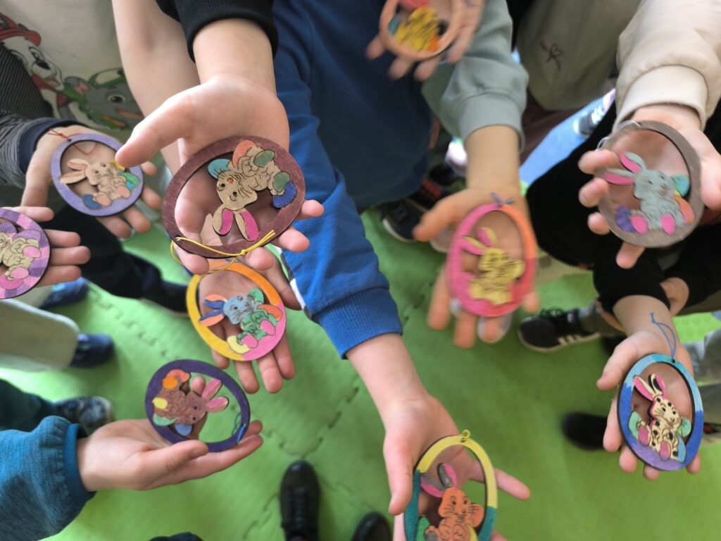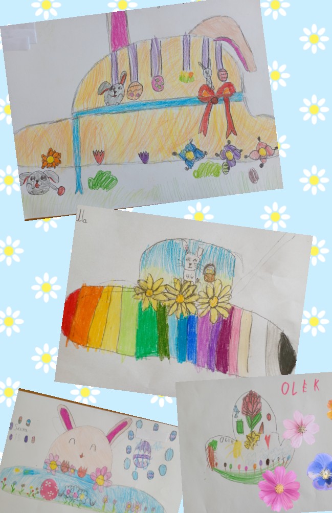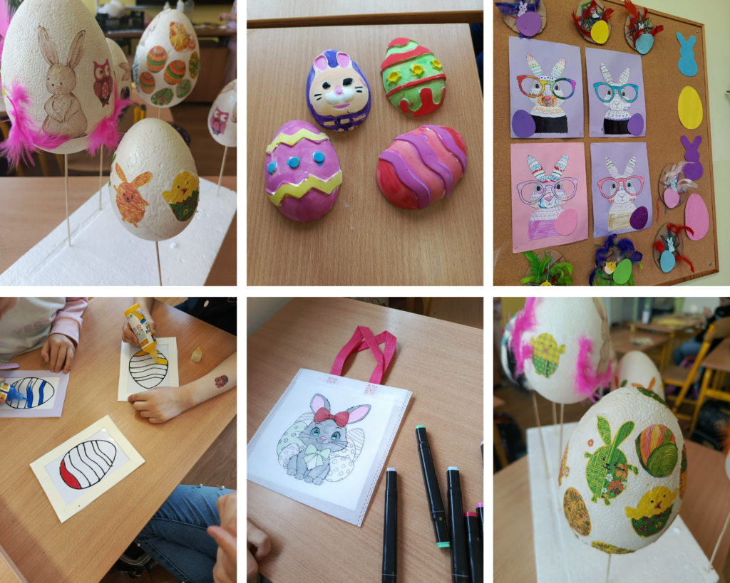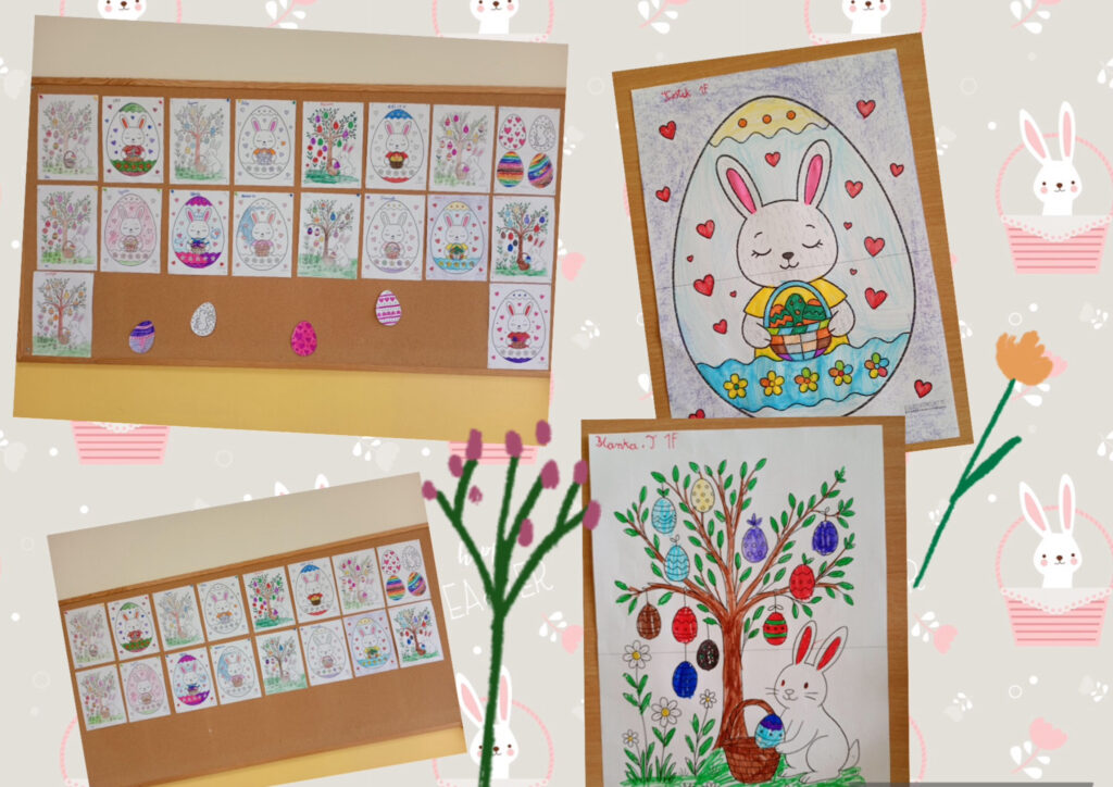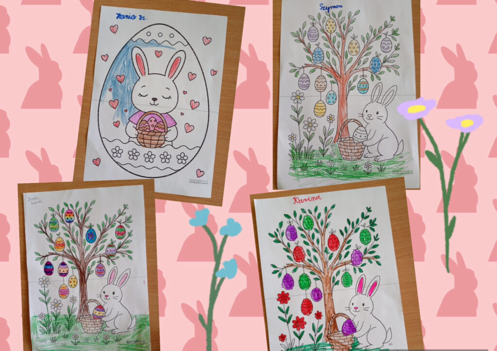 W marcu uczniowie klasy 1b uczestniczyli w różnorodnych zajęciach plastycznych. Dzieci malowały torby oraz gipsowe jajka. Dużo radości sprawiło również ozdabianie styropianowych jajek. Uczniowie pracowali także z farbami witrażowymi, tworząc barwne i efektowne kompozycje. W ramach ćwiczeń grafomotorycznych dzieci wykonywały prace przedstawiające królika, doskonaląc przy tym sprawność ręki i precyzję ruchów oraz ozdabiali jajka włóczką i piórkami.
